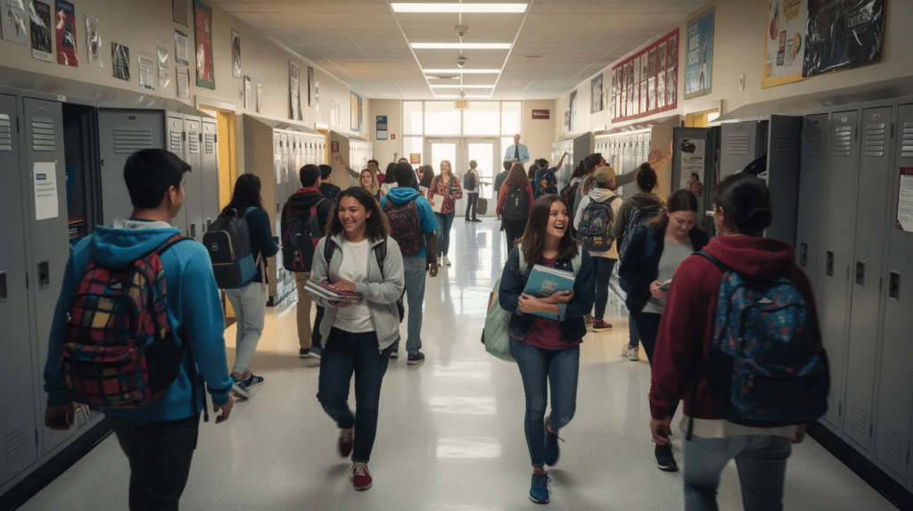 Secondary school environments introduce crowded hallways, shifting timetables, and complex social hierarchies